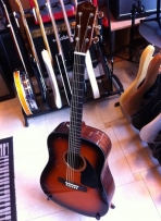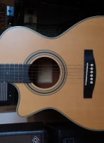 Chitarra acustica mancina (left-hand) 6 corde con custodia inclusa. Tavola armonica in abete con fasce e fondo in mogano. Cut way : spalla mancante. Elettrificazione : Fishman Presys II con accordatore.