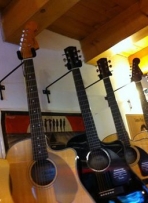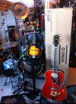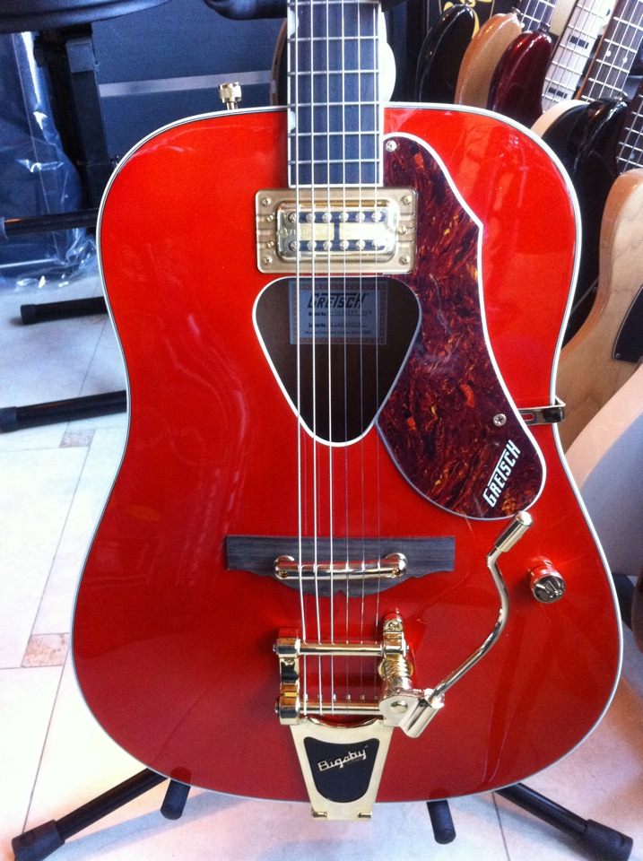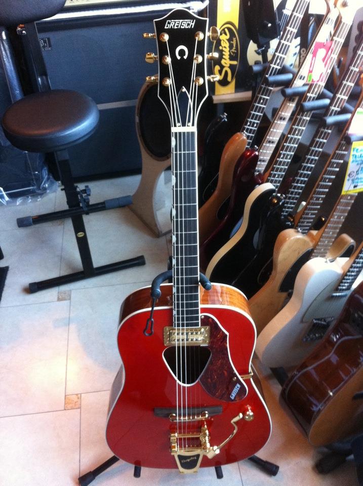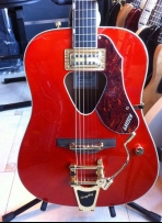 Chitarra acustica Dreadnought con tavola armonica in Abete Massello , fondo e fasce in Mogano e catenatura a X , Neck in Mogano con segnatasti neoclassic 21 tasti - Ponte palissandro con sellette compensate , buca triangolare battipenna Rancher - Humbaker FideliTron e Ponte BIGSBY B70 Gold con leva Vintage